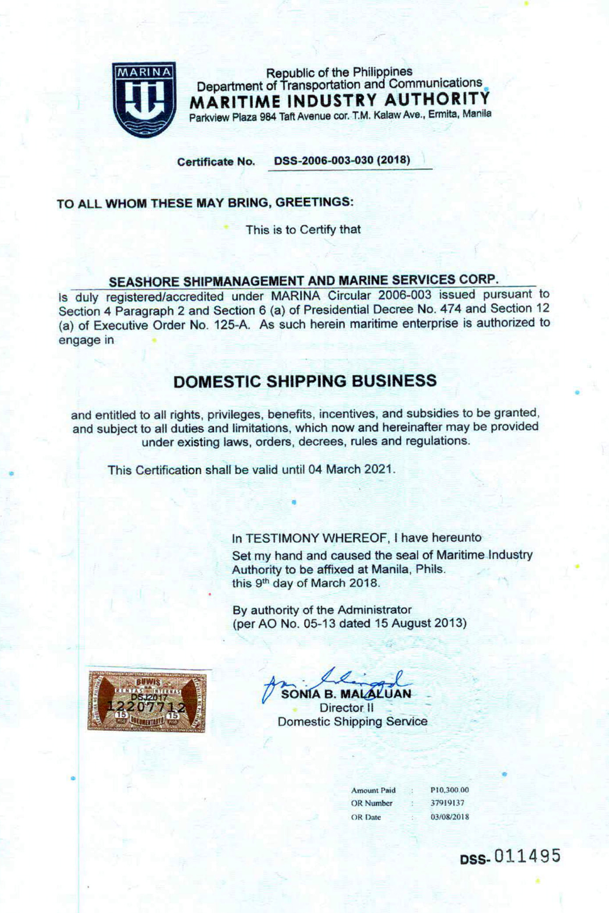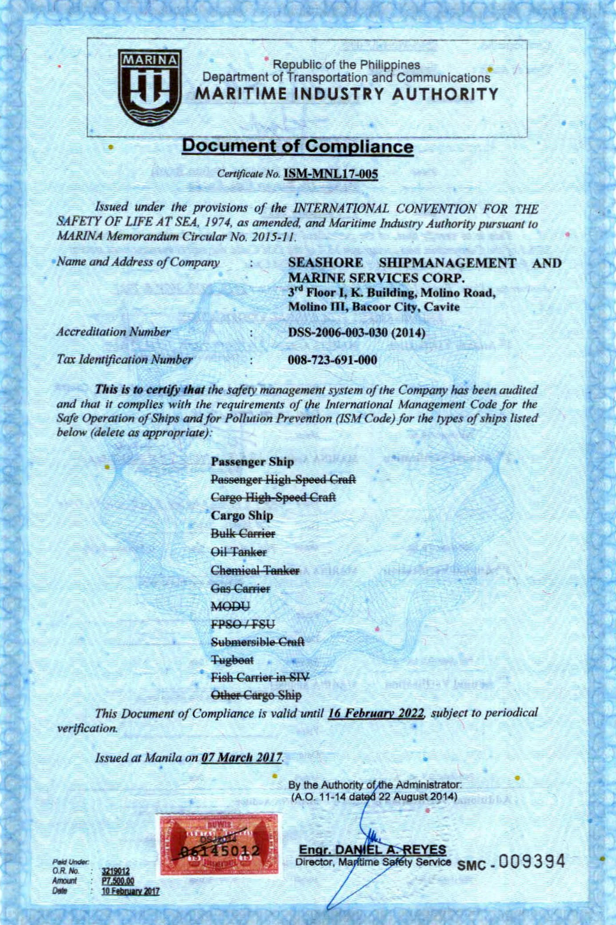 SeaShore Shipmanagement and Marine Services Corporation is an ISM-DOC Certified company and registered/accredited to own, operate and manage ships. Managed by Technical, HR, Finance and Accounting people who once worked with Magsaysay Ship Management Inc., National Shipping Corporation of the Philippines and National Chemical Carriers of Saudi Arabia. Top management had been in the ship management industry for more than thirty five (35) years and are in the field of managing tanker vessels, container vessels, bulk ships, passenger ships, barges, tug boats, yachts and service boats. The company is presently managing a RORO ship and passenger boat of CE Casecnan Power plant, Yachts of Mr. Henry Sy, Okada Game and Casino and SeaShore owned yacht, cargo boat of Island Star and ship management consultancy of a tanker ship.
